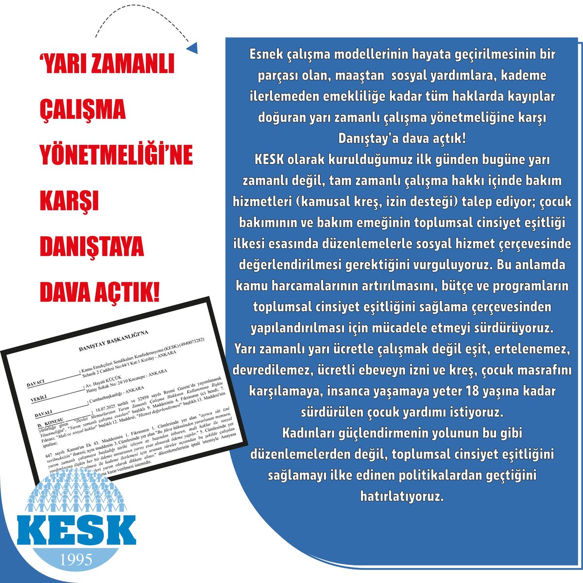 Kamu Emekçileri Sendikaları Konfederasyonu (KESK), maaştan sosyal yardımlara, kademe ilerlemeden emekliliğe kadar tüm haklarda kayıplar doğurduğunu belirterek yarı zamanlı çalışma yönetmeliğine karşı Danıştay'a dava açtı.