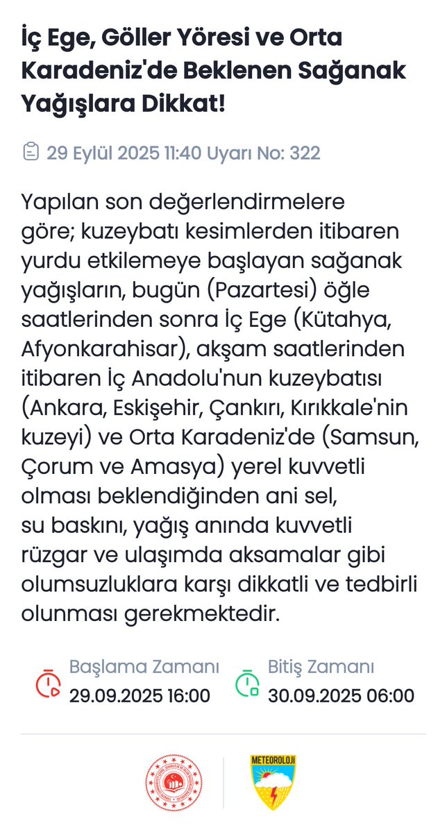 Çevre, Şehircilik ve İklim Değişikliği Bakanlığı Meteoroloji Genel Müdürlüğü, İç Ege, Göller Yöresi ve Orta Karadeniz bölgeleri için önemli bir meteorolojik uyarı yayımladı. Bölgede beklenen şiddetli sağanak yağışlar nedeniyle vatandaşların ve yetkililerin tedbirli olması istendi.