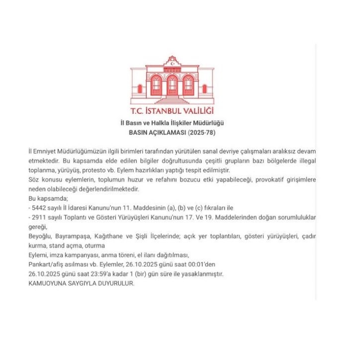 İstanbul'da kamu düzenini ve güvenliği sağlamak amacıyla alınan bir kararla, dört ilçede belirli bir süre için miting ve yürüyüş gibi toplu etkinlikler yasaklandı. Beyoğlu, Şişli, Kağıthane ve Bayrampaşa ilçelerini kapsayan bu yasak, olası güvenlik risklerinin önüne geçmek için hayata geçirildi.