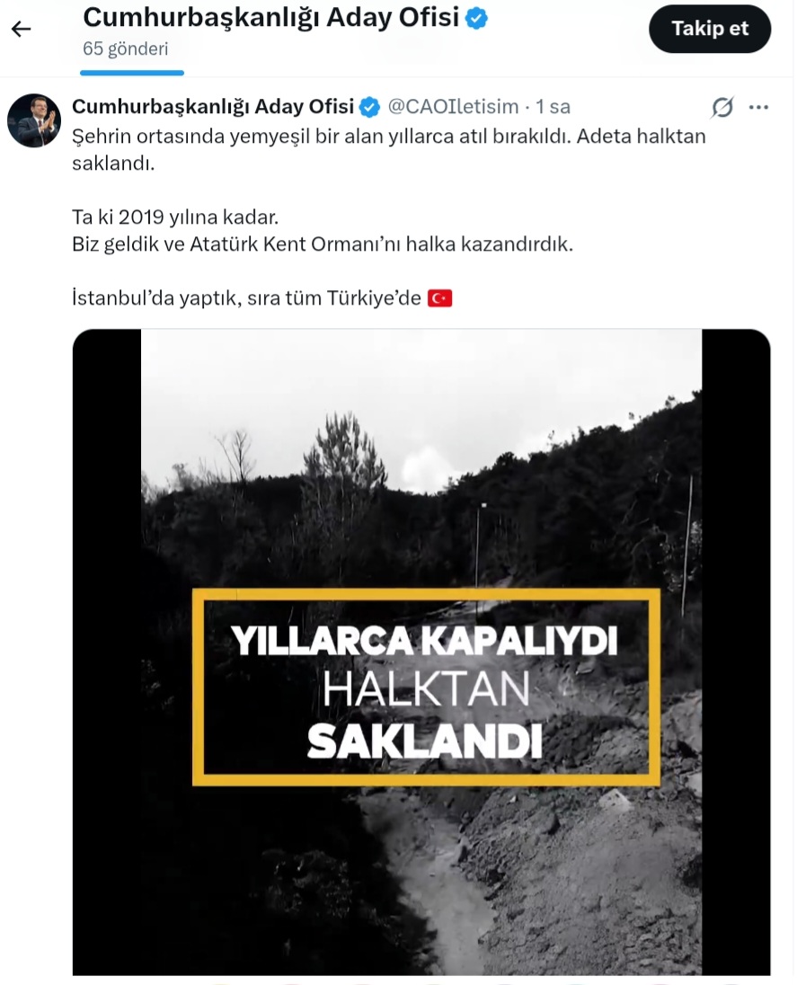 CHP'nin Cumhurbaşkanı Adayı ve İstanbul Büyükşehir Belediye (İBB) Başkanı Ekrem İmamoğlu, sosyal medya üzerinden yaptığı bir paylaşımla dikkatleri yeniden kent yeşiline ve hizmet modeline çekti. İmamoğlu, Atatürk Kent Ormanı'nda gerçekleştirilen çalışmaları gösteren bir video yayınlayarak, "İstanbul’da yaptık, sıra tüm Türkiye’de" ifadelerini kullandı.