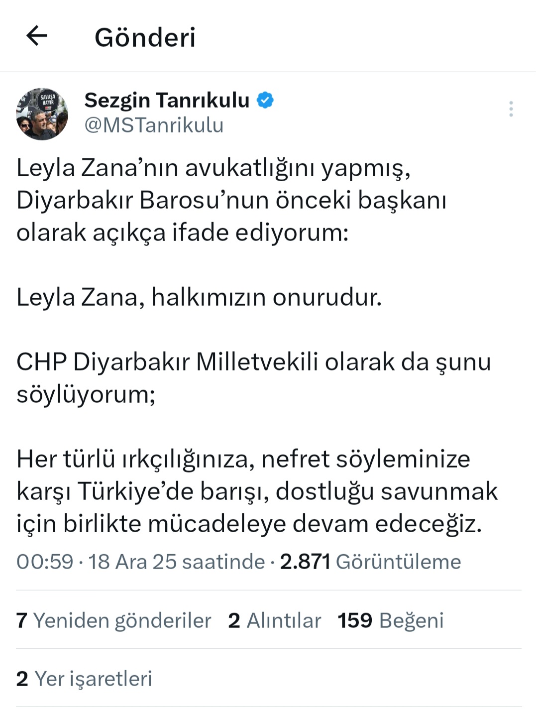 Cumhuriyet Halk Partisi (CHP) Genel Başkan Yardımcısı ve Diyarbakır Milletvekili Sezgin Tanrıkulu, X sosyal medya platformu üzerinden dikkat çeken bir açıklama yaptı. Tanrıkulu, paylaşımında hem Leyla Zana'nın eski avukatı ve Diyarbakır Barosu'nun önceki başkanı sıfatıyla hem de CHP'li bir milletvekili olarak görüşlerini kamuoyuyla paylaştı.