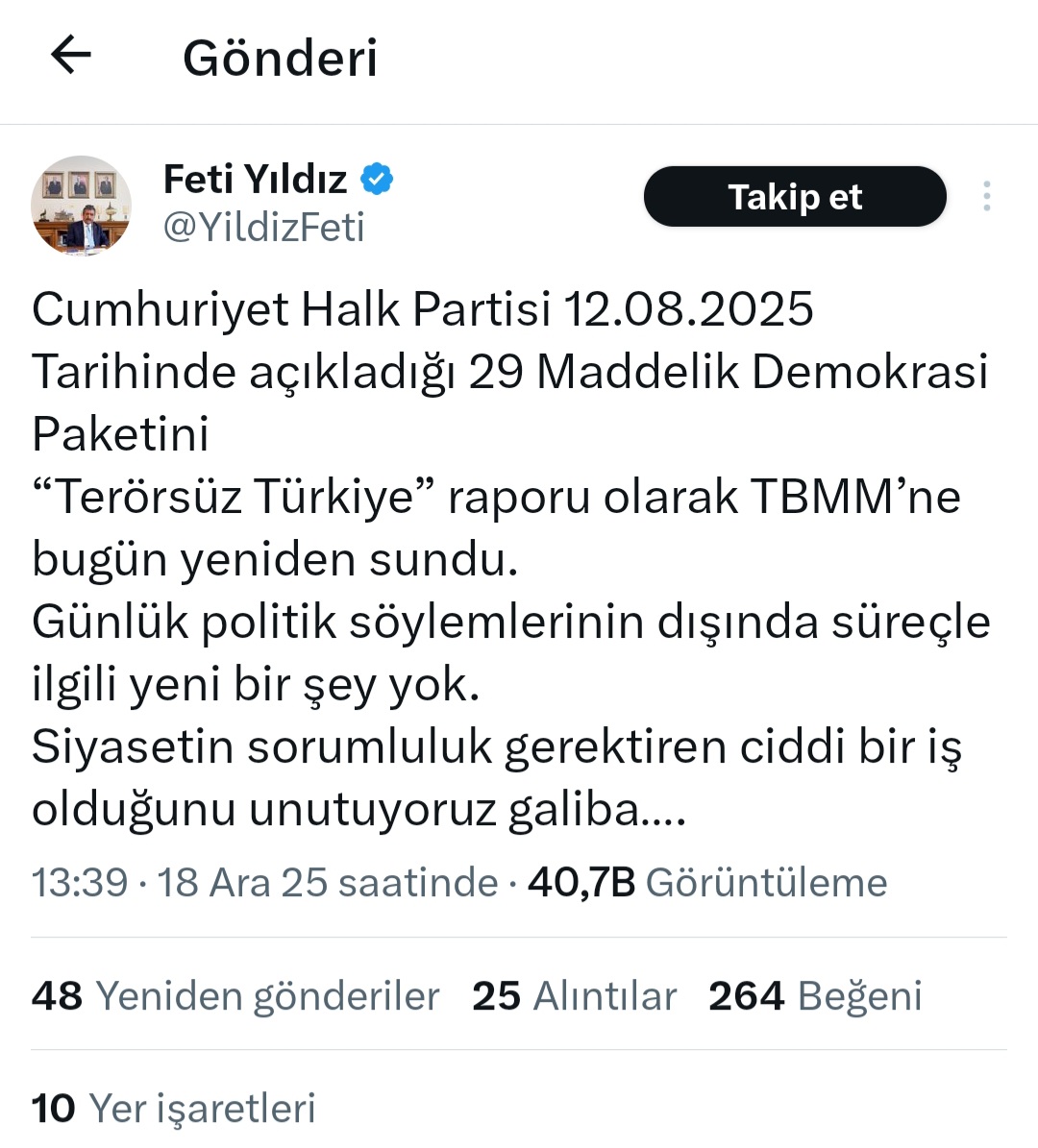"Cumhuriyet Halk Partisi 12.08.2025 tarihinde açıkladığı 29 maddelik Demokrasi Paketini ‘Terörsüz Türkiye’ raporu olarak TBMM’ne bugün yeniden sundu. Günlük politik söylemlerinin dışında söyleyecek yeni bir şeyleri olmadığı bir kez daha görüldü. Galiba hepimiz, siyasetin sorumluluk gerektiren ciddi bir iş olduğunu unutuyoruz."
