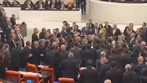 Bu sert diyaloğun ardından, AK Parti'li Mustafa Varank'ın "sataşmadan" söz istemesi üzerine kürsüde başlayan tartışma, milletvekilleri arasında hızla yayılarak fiziki bir arbede ortamına dönüştü. Grupların birbirine girdiği arbede sırasında Genel Kurul salonundaki saksı ve mikrofonlar devrildi. Yaşanan gerginlik üzerine TBMM Başkanı Numan Kurtulmuş, birleşime ara vermek zorunda kaldı.