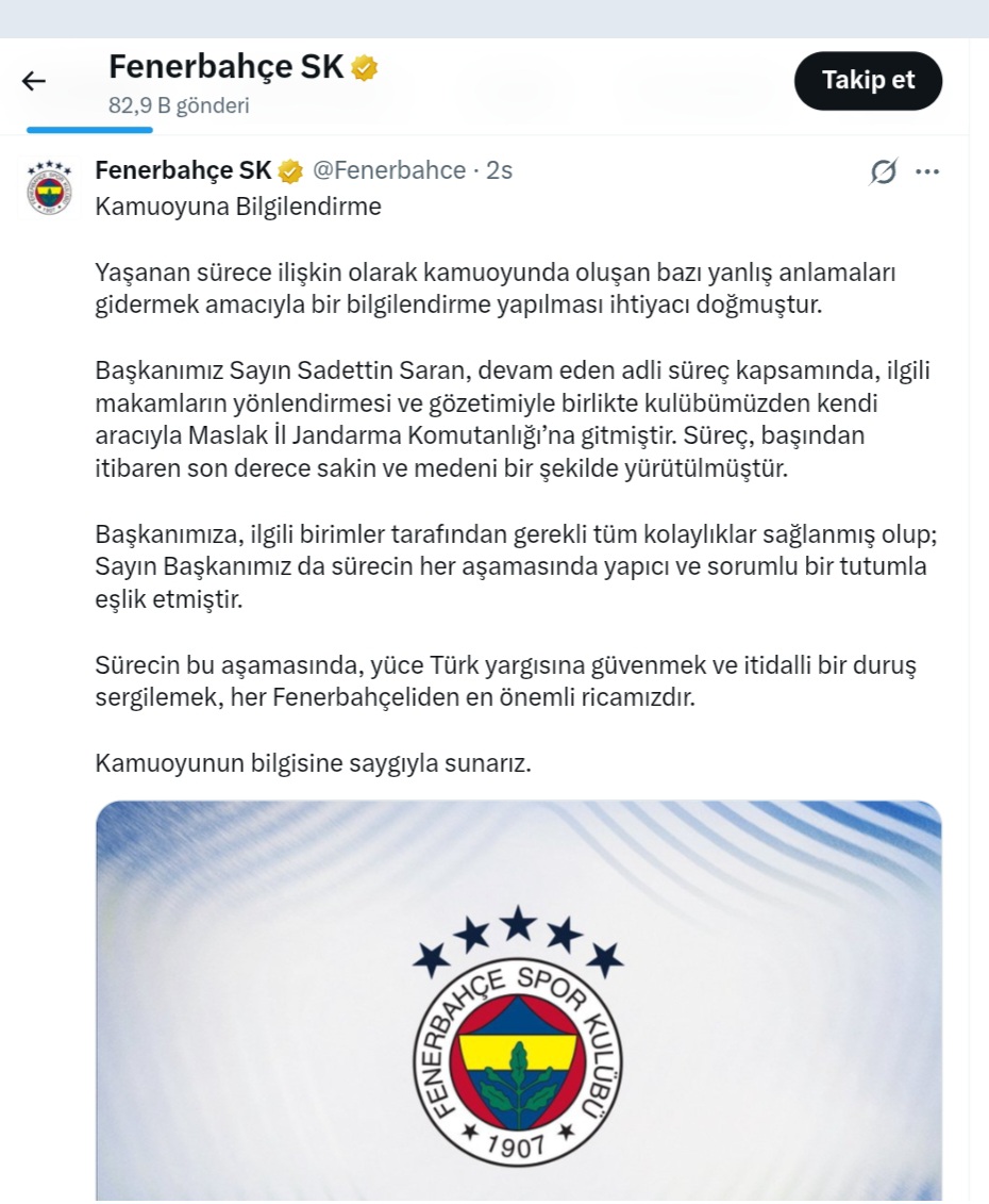 Fenerbahçe Spor Kulübü, Başkan Sadettin Saran'ın bugün Maslak İl Jandarma Komutanlığı'na yaptığı ziyaretle ilgili resmi bir açıklama yayınladı. Kulübün X hesabından "Kamuoyuna Bilgilendirme" başlığıyla duyurulan açıklamada, yaşanan sürece ilişkin oluşan "yanlış anlamaları gidermek" amacıyla bilgi verildiği belirtildi.