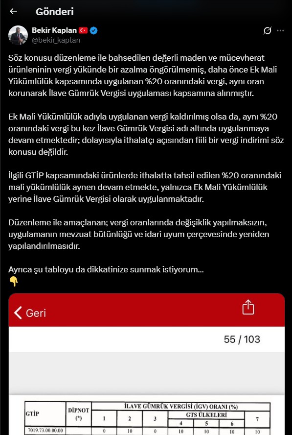Resmi Gazete’nin 31 Aralık 2025 tarihli mükerrer sayısında yayımlanan bir Cumhurbaşkanı Kararı, altın ve mücevher sektöründe vergi değişikliği tartışmaları başlattı. 10804 sayılı kararla, daha önce "Ek Mali Yükümlülük" adı altında tahsil edilen verginin 1 Şubat 2026 itibarıyla kaldırılacağı açıklandı. Bu durum, özellikle AB ve serbest ticaret anlaşması bulunmayan ülkelerden yapılan altın, pırlanta ve mücevher ithalatındaki %20'lik ek yükün ortadan kalktığı yönünde yorumlandı.