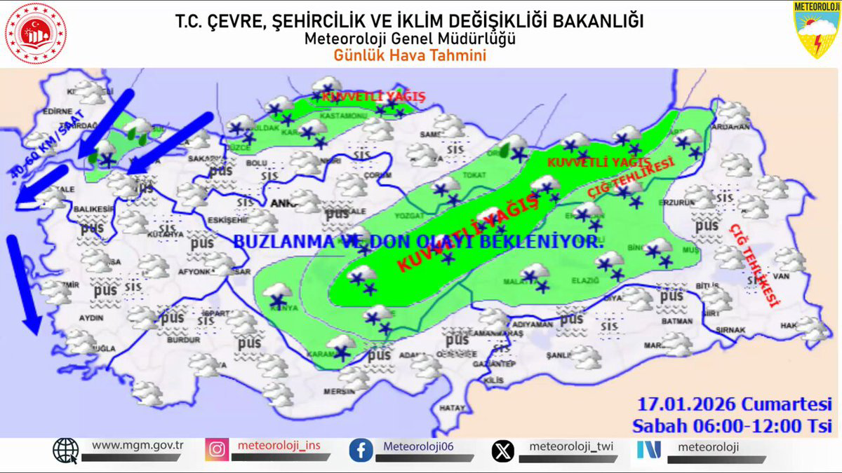 Çevre, Şehircilik ve İklim Değişikliği Bakanlığı Meteoroloji Genel Müdürlüğü, 17 Ocak 2026 Cumartesi günü için önemli hava durumu uyarılarında bulundu. Yapılan son değerlendirmeler, ülke genelinde birden fazla meteorolojik tehlikenin aynı anda etkili olacağını gösteriyor.