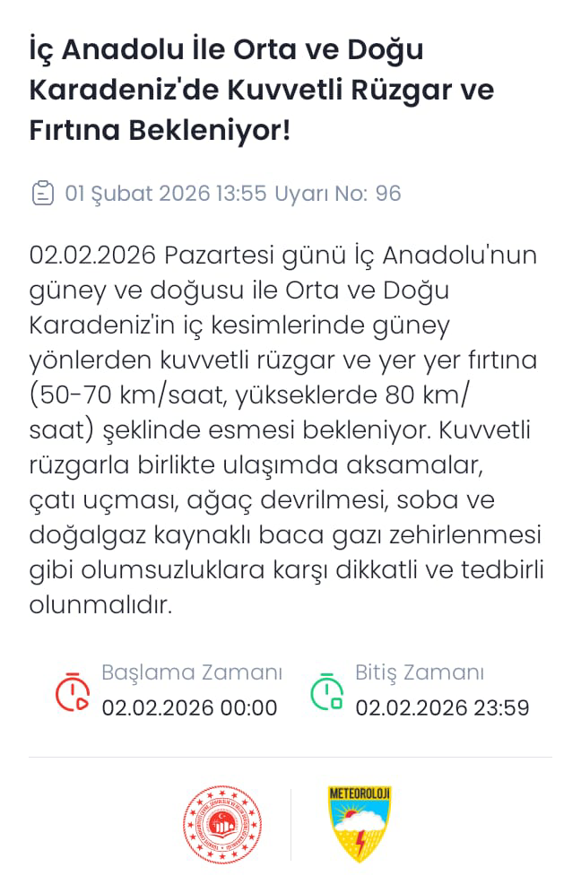 Çevre, Şehircilik ve İklim Değişikliği Bakanlığı Meteoroloji Genel Müdürlüğü, yaptığı son değerlendirmeler sonucunda İç Anadolu Bölgesi ile Orta ve Doğu Karadeniz Bölgeleri için kuvvetli rüzgar ve fırtına uyarısında bulundu.