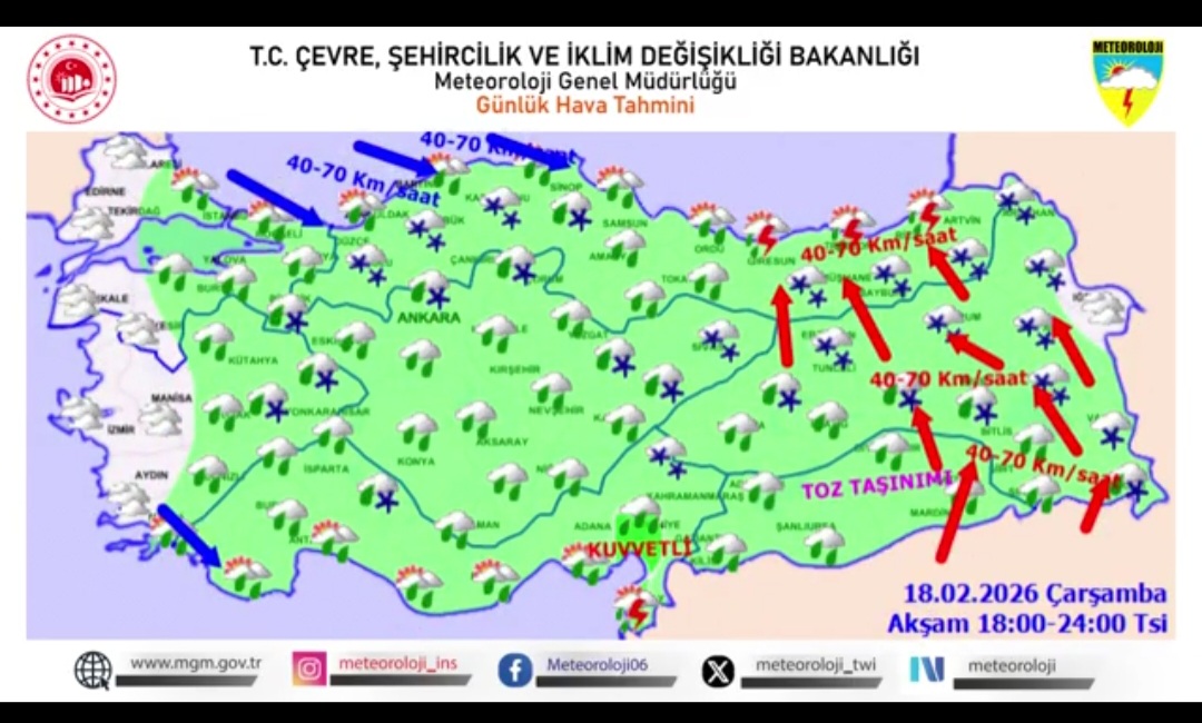 Meteoroloji Genel Müdürlüğü'nün son verileri, 18 Şubat 2026 Çarşamba gününün yurt geneli için meteorolojik açıdan zorlu geçeceğine işaret ediyor. Birbirinden farklı dört tehlikenin aynı anda etkili olması beklenirken, vatandaşların olası olumsuzluklara karşı uyanık olması gerekiyor.