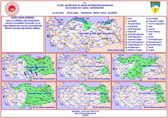 Çevre, Şehircilik ve İklim Değişikliği Bakanlığı'na bağlı Meteoroloji Genel Müdürlüğü, 9 Mart 2026 tarihini kapsayan haftalık hava tahmin raporunu yayınladı. Raporda, Türkiye'nin farklı bölgelerinde sıcaklıkların mevsim normallerine göre değişkenlik göstereceği belirtildi.