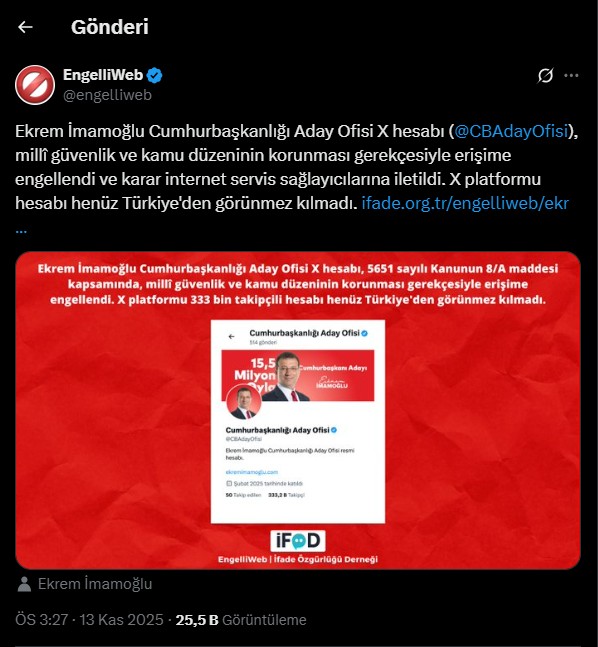 İstanbul Büyükşehir Belediye Başkanı Ekrem İmamoğlu'nun 8 Mayıs'ta kişisel X hesabı da Türkiye'den erişime kapatılmıştı. İmamoğlu, bu engelin ardından "Cumhurbaşkanlığı Aday Ofisi" hesabı üzerinden paylaşımlarına devam etmişti. Son kararla birlikte İmamoğlu'nun X'teki ikinci ana hesabı daha erişime kapatılmış oldu.