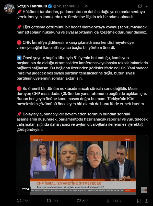 Yaşanan gelişmeleri "önemli bir dönüm noktası" olarak nitelendiren Tanrıkulu, ancak bunun "sürecin sonu olmadığının" altını çizdi. "Masa duruyor; CHP masadadır. Çözümden yana tutumunu bugün de açıklamıştır" diyerek partisinin uzlaşı arayışındaki kararlılığını vurguladı. Tanrıkulu, "Bunun her şeyin önüne konulmasını doğru bulmam. Türkiye'nin Kürt meselesinin çözümünü önceleyen biri olarak da bunu ifade etmek isterim" şeklinde konuştu.