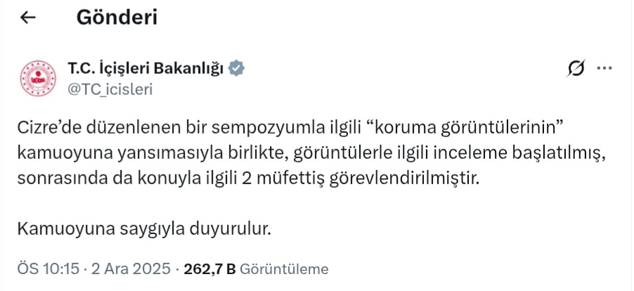 Cizre’de düzenlenen bir sempozyumla ilgili “koruma görüntülerinin” kamuoyuna yansımasıyla birlikte, görüntülerle ilgili inceleme başlatılmış, sonrasında da konuyla ilgili 2 müfettiş görevlendirilmiştir.
