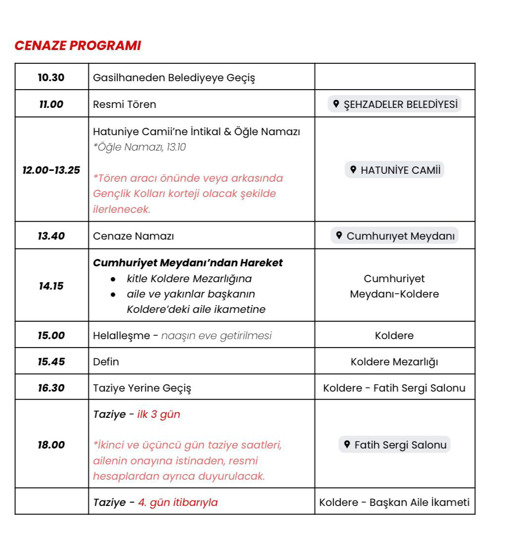 Cenaze Namazı: Naş, Hatuniye Camii'ne getirilecek ve öğle namazını müteakip Cumhuriyet Meydanı'nda cenaze namazı kılınacak.