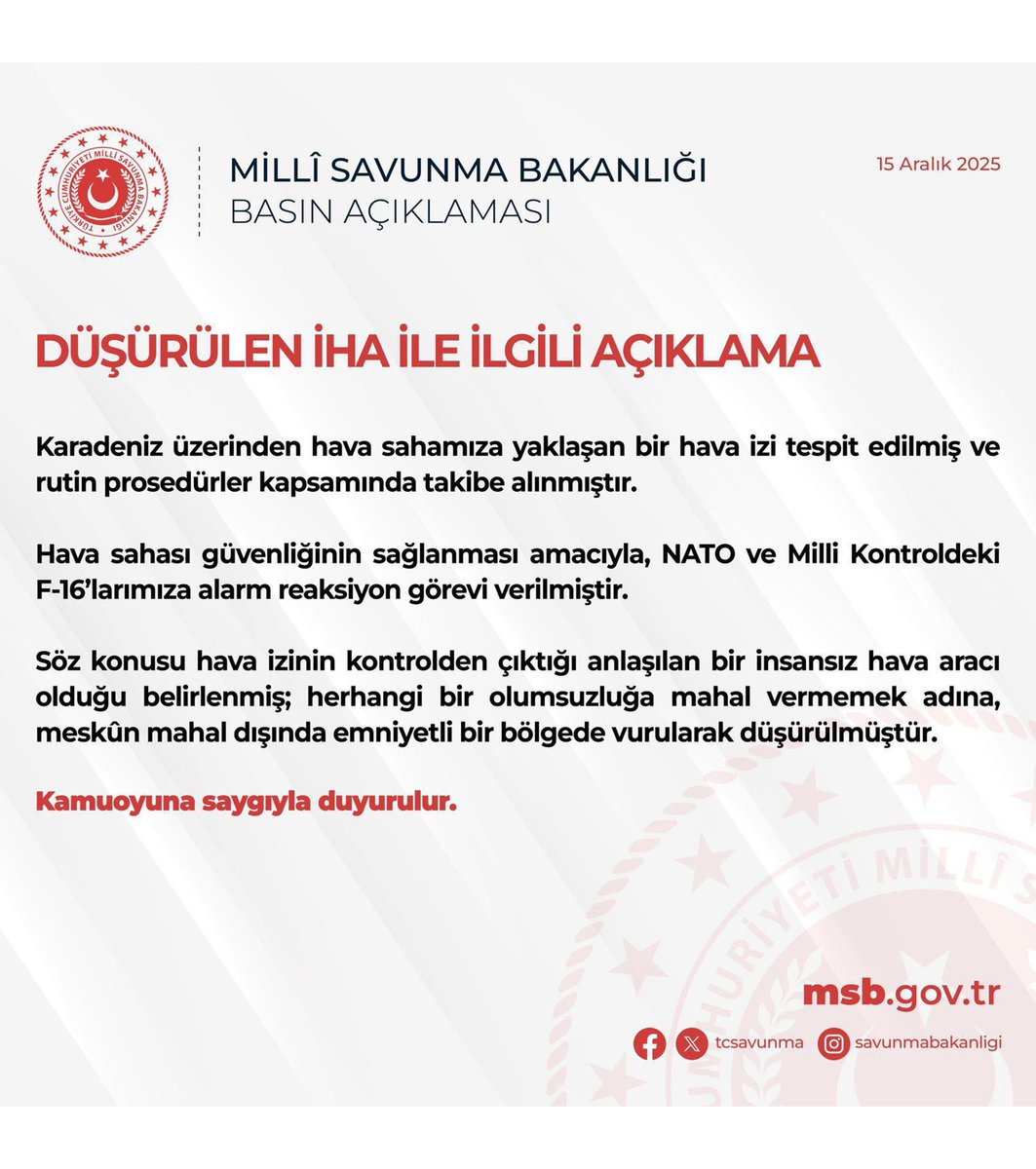 Olay, bugün Karadeniz bölgesinde meydana geldi. Türkiye'nin hava savunma sistemleri tarafından tespit edilen ve tanımlanamayan İHA, hava sahasına doğru yaklaşımı nedeniyle potansiyel bir güvenlik tehdidi olarak değerlendirildi. Bu kritik durum üzerine, Türk Hava Kuvvetleri alarm durumuna geçti.