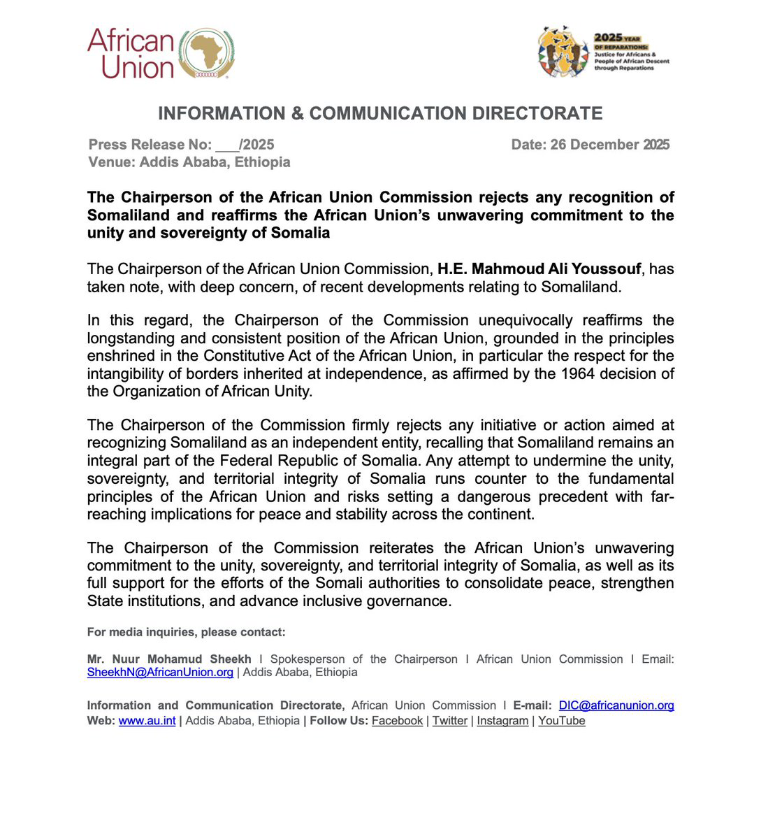 Açıklamada, Somali Federal Cumhuriyeti'nin toprak bütünlüğünün ve egemenliğinin tanınmasının önemine vurgu yapıldı. Afrika Birliği, tek yanlı tanıma girişimlerinin bölgesel barışı tehlikeye atabileceği endişesini taşıyor. Somali hükümeti, Somaliland'ın kendi topraklarının bir parçası olduğunu ve uluslararası düzeyde tanınmaması gerektiğini sürekli olarak dile getiriyor.