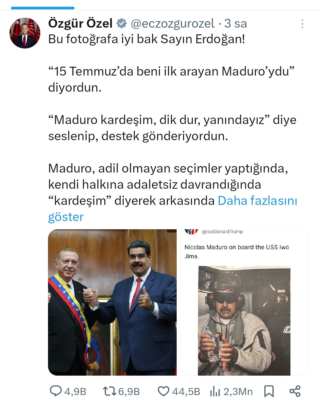 CHP Genel Başkanı Özgür Özel, sosyal medya üzerinden yaptığı sert paylaşımla gündeme oturdu. Özel, Amerika Birleşik Devletleri tarafından kaçırıldığı iddia edilen Venezuela Devlet Başkanı Nicolás Maduro'ya ait olduğu belirtilen bir fotoğraf paylaşarak, Cumhurbaşkanı Recep Tayyip Erdoğan'a seslendi.