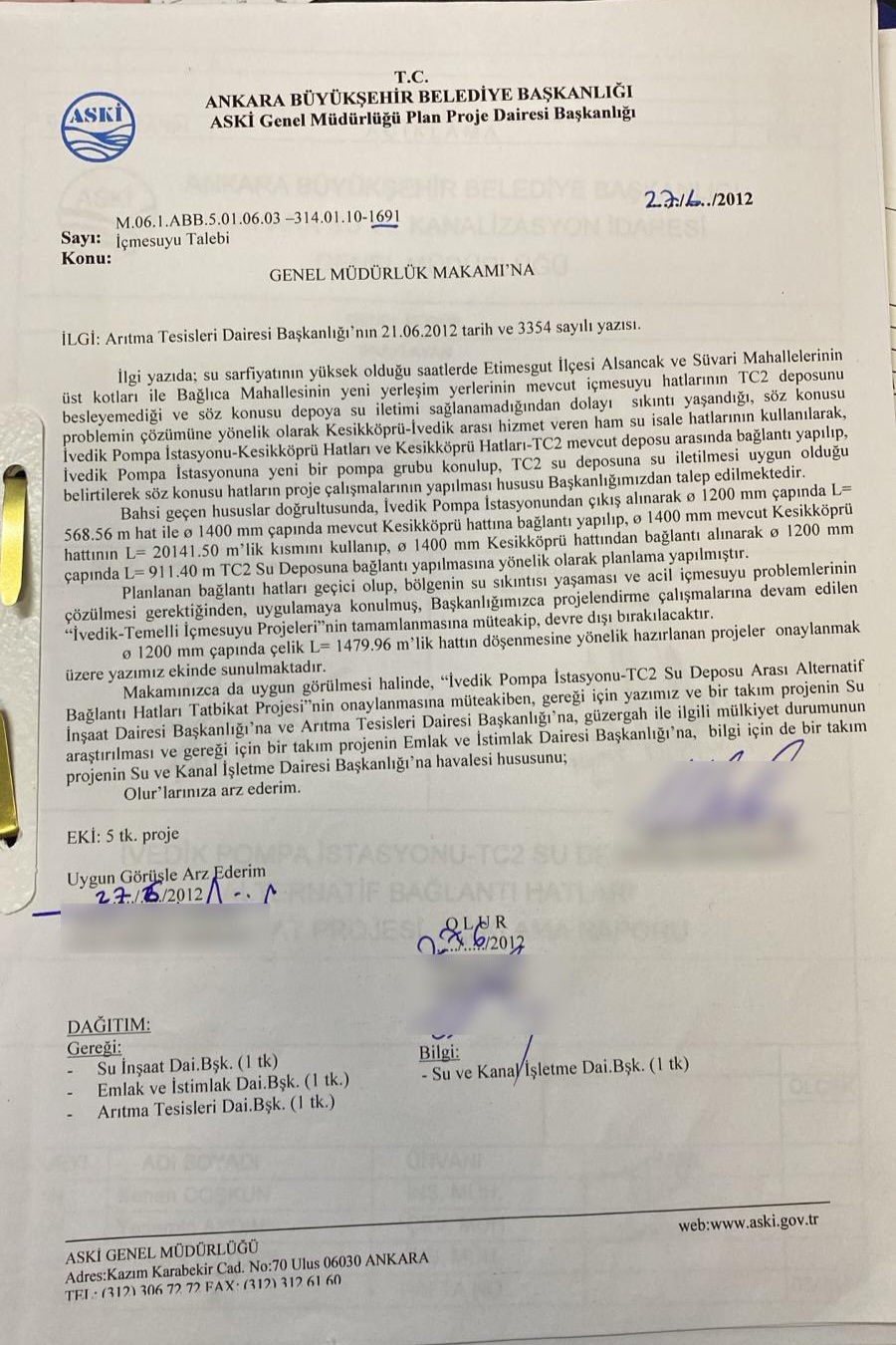 Konuya ilişkin yazılı bir açıklama yapan Ankara Büyükşehir Belediyesi, ASKİ arşivlerinden çıkan 2012 tarihli resmi belgeleri kamuoyuna sundu. Belgeler, Gökçek'in iddia ettiği 3. hattın, kendi döneminde, 2013 yılında devre dışı bırakıldığını ortaya koyuyor. Açıklamada, Etimesgut-Bağlıca bölgesinin teknik olarak Kesikköprü'den cazibe (yerçekimi) ile su alması gerektiği, ancak bu sistemin Gökçek döneminde iptal edildiği kaydedildi.