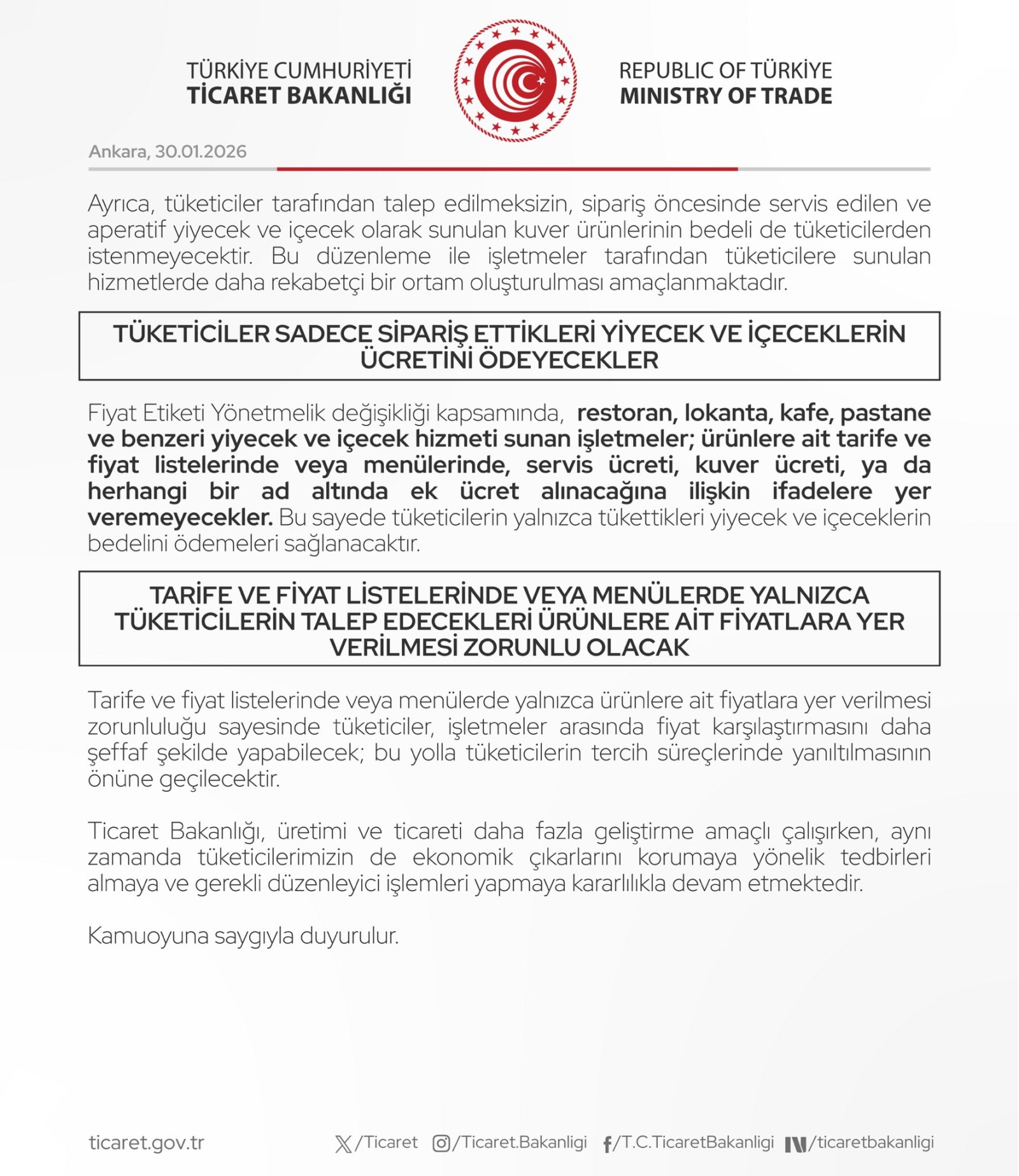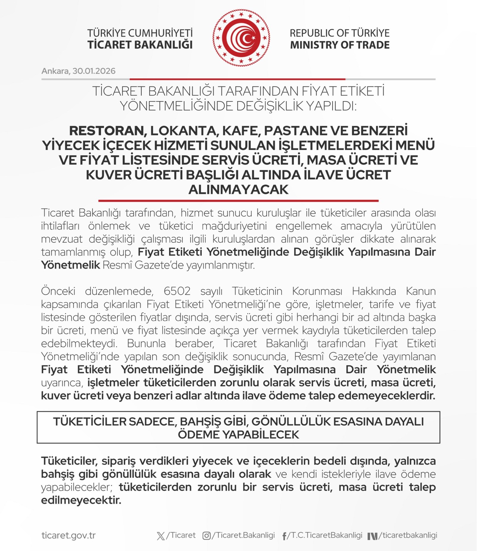 Yayınlanan değişikliğe göre; restoran, lokanta, kafe, pastane, birahane, tatlıcı, çay bahçesi gibi yiyecek ve içecek hizmeti sunan tüm işletmeler, fiyat listelerinde (menülerde) "servis ücreti", "masa ücreti" veya "kuver ücreti" başlıkları altında müşterilerden ilave bir ücret talep edemeyecek. Bu ücretler, eğer varsa, temel menü fiyatlarının içinde maliyete yansıtılmak zorunda olacak. Tüketici, menüde gördüğü fiyatın nihai ödeyeceği tutar olduğundan emin olabilecek.
