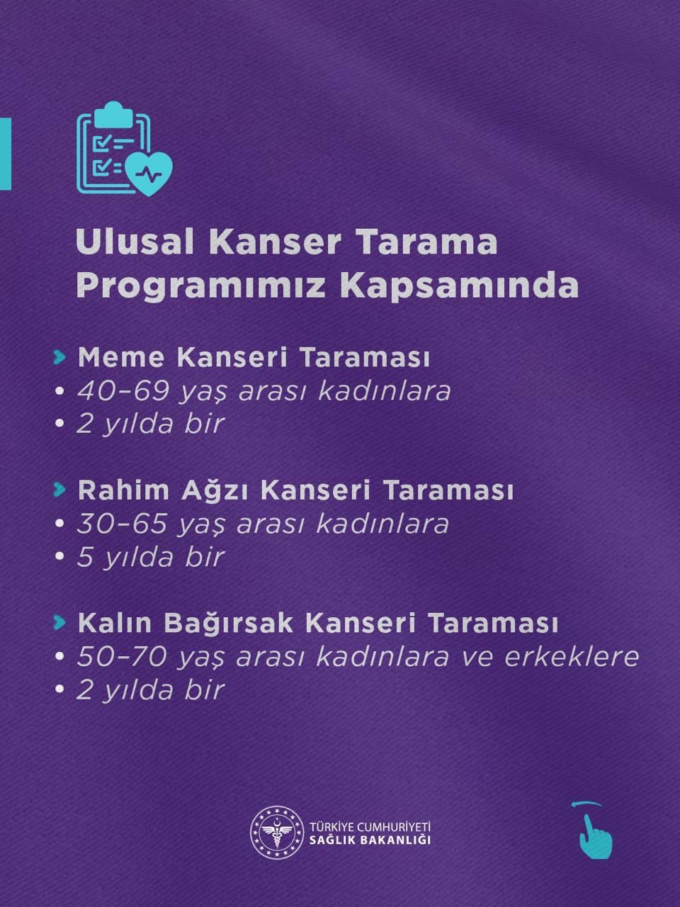 Sağlık Bakanlığı, #ErkenTeşhisHayatKurtarır hashtag'i ile başlattığı farkındalık çalışması kapsamında tüm vatandaşları, kendileri ve sevdikleri için bu ücretsiz tarama olanaklarından yararlanmaya çağırıyor. Tarama programlarına katılım, kanserden korunma ve erken tanı stratejilerinin en etkili ayağını oluşturuyor.