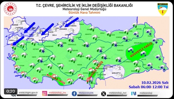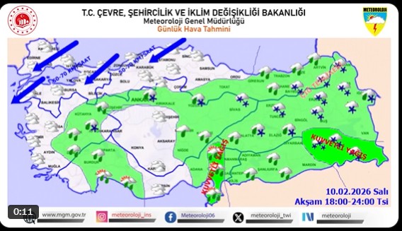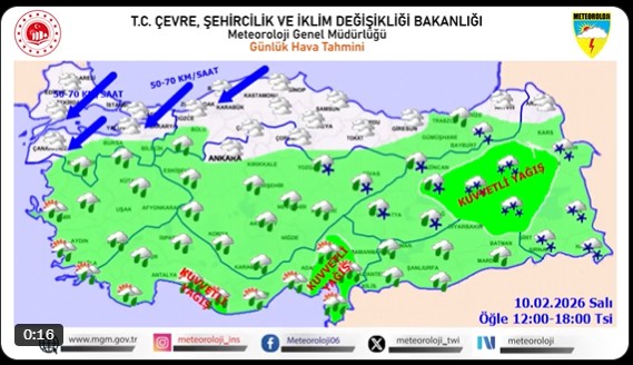 Yağışlar özellikle Doğu Anadolu, Doğu Akdeniz ve Güneydoğu Anadolu Bölgeleri'nde etkili olacak. Antalya'nın doğusu, Adana'nın doğusu, Kahramanmaraş'ın batısı, Hatay, Osmaniye, Erzurum, Ağrı, Bitlis, Tunceli, Bingöl, Muş, Hakkari, Şırnak, Batman ve Siirt çevrelerinde yağışların yer yer kuvvetli şiddette olması bekleniyor.