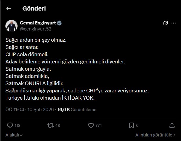 Enginyurt, paylaşımında dikkat çeken ifadelere yer verdi. "Sağcılardan bir şey olmaz. Sağcılar satar. CHP sola dönmeli. Aday belirleme yöntemi gözden geçirilmeli diyenler" şeklindeki yaklaşımları hedef alan milletvekili, şu cümleleri kullandı: