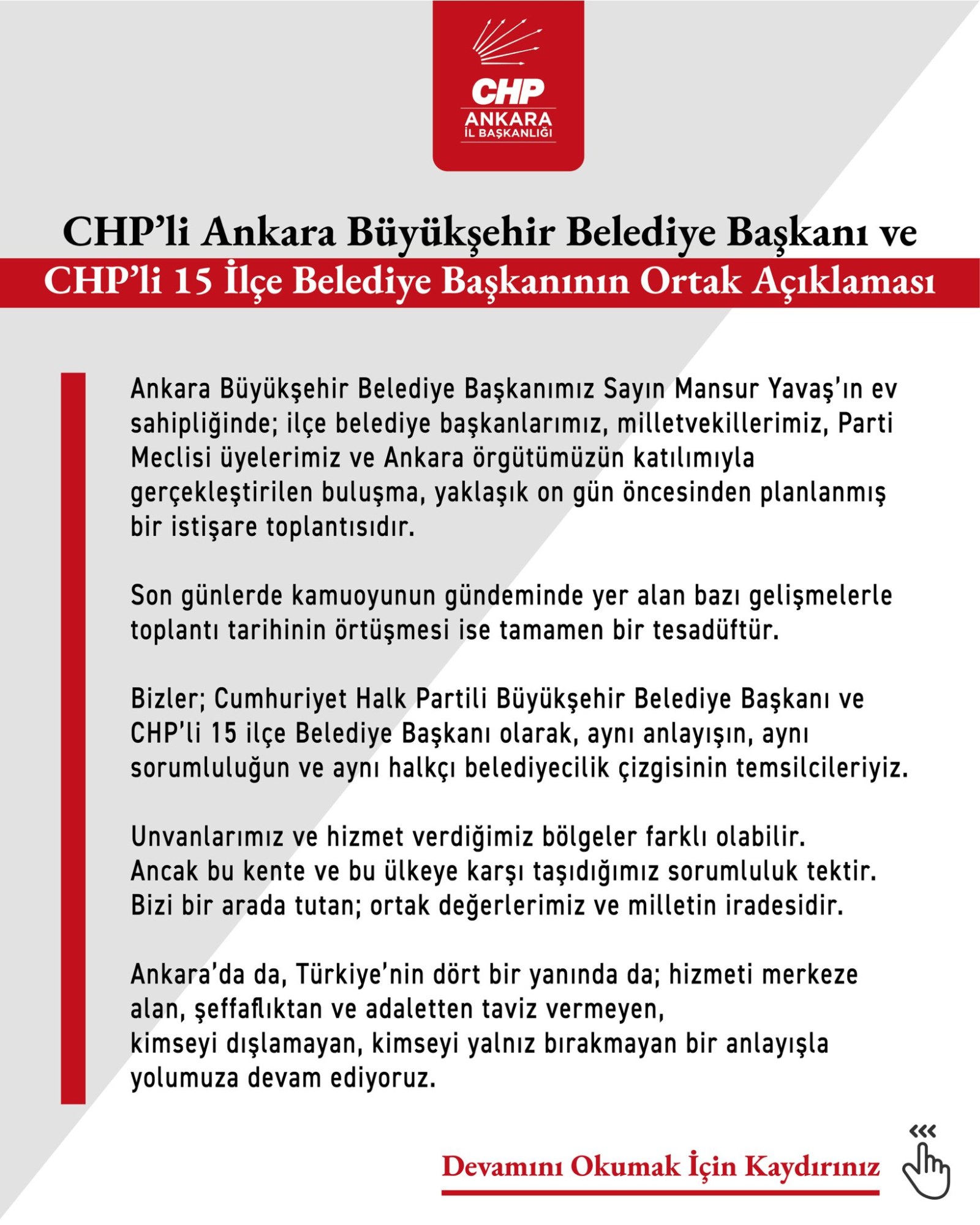 Açıklamada, "Cumhuriyet Halk Partili Büyükşehir Belediye Başkanı ve CHP’li 15 ilçe Belediye Başkanı olarak, aynı anlayışın, aynı sorumluluğun ve aynı halkçı belediyecilik çizgisinin temsilcileriyiz" denildi. Unvanlar ve hizmet bölgeleri farklı olsa da, kente ve ülkeye karşı taşınan sorumluluğun ortak olduğu vurgulandı.