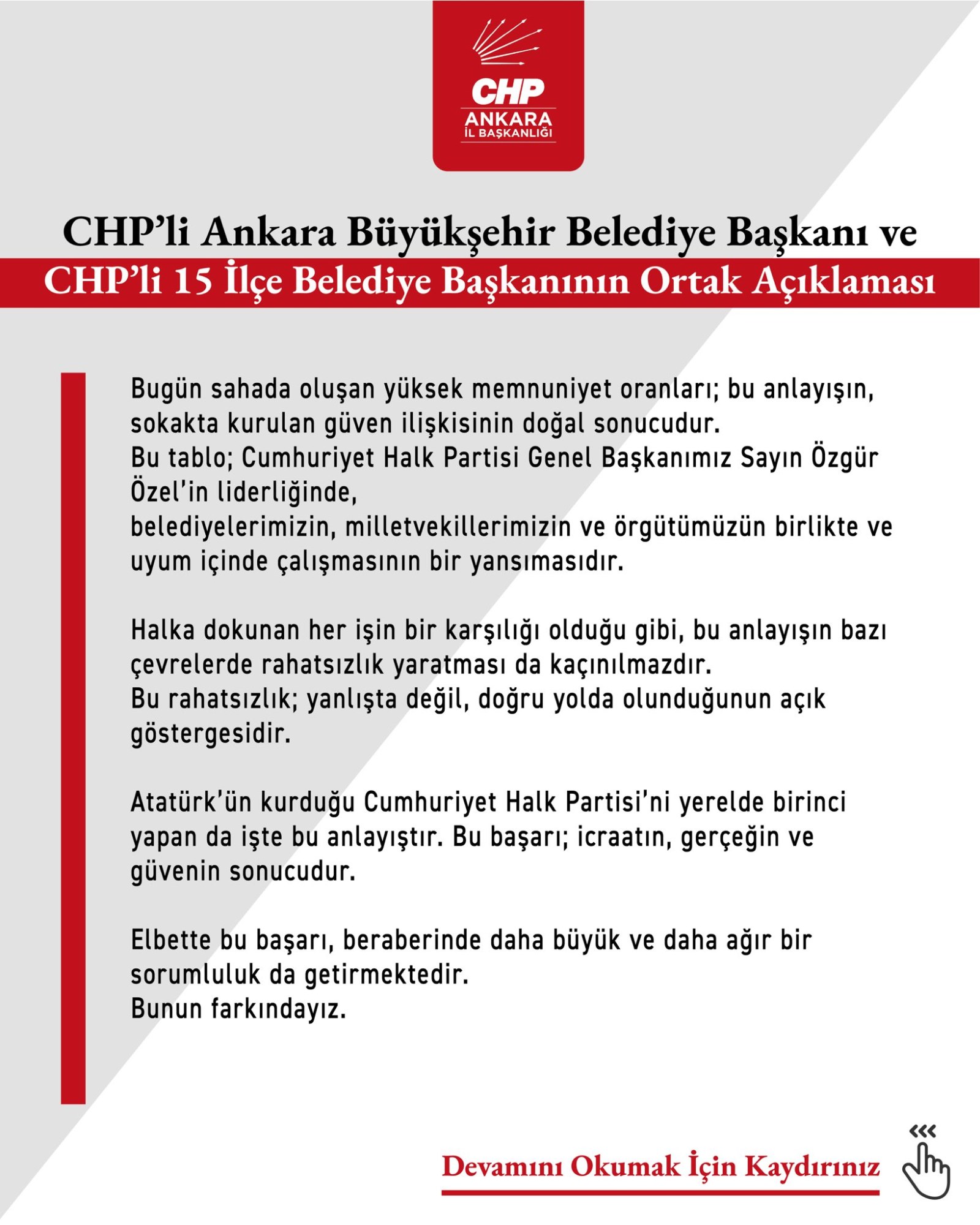 Dikkat çeken ifadelerden biri de, "Halka dokunan her işin bir karşılığı olduğu gibi, bu anlayışın bazı çevrelerde rahatsızlık yaratması da kaçınılmazdır. Bu rahatsızlık; yanlışta değil, doğru yolda olunduğunun açık göstergesidir" oldu. Açıklamada, CHP'nin yerelde birinci parti olmasının, icraat, gerçeklik ve güvenin sonucu olduğu da dile getirildi.