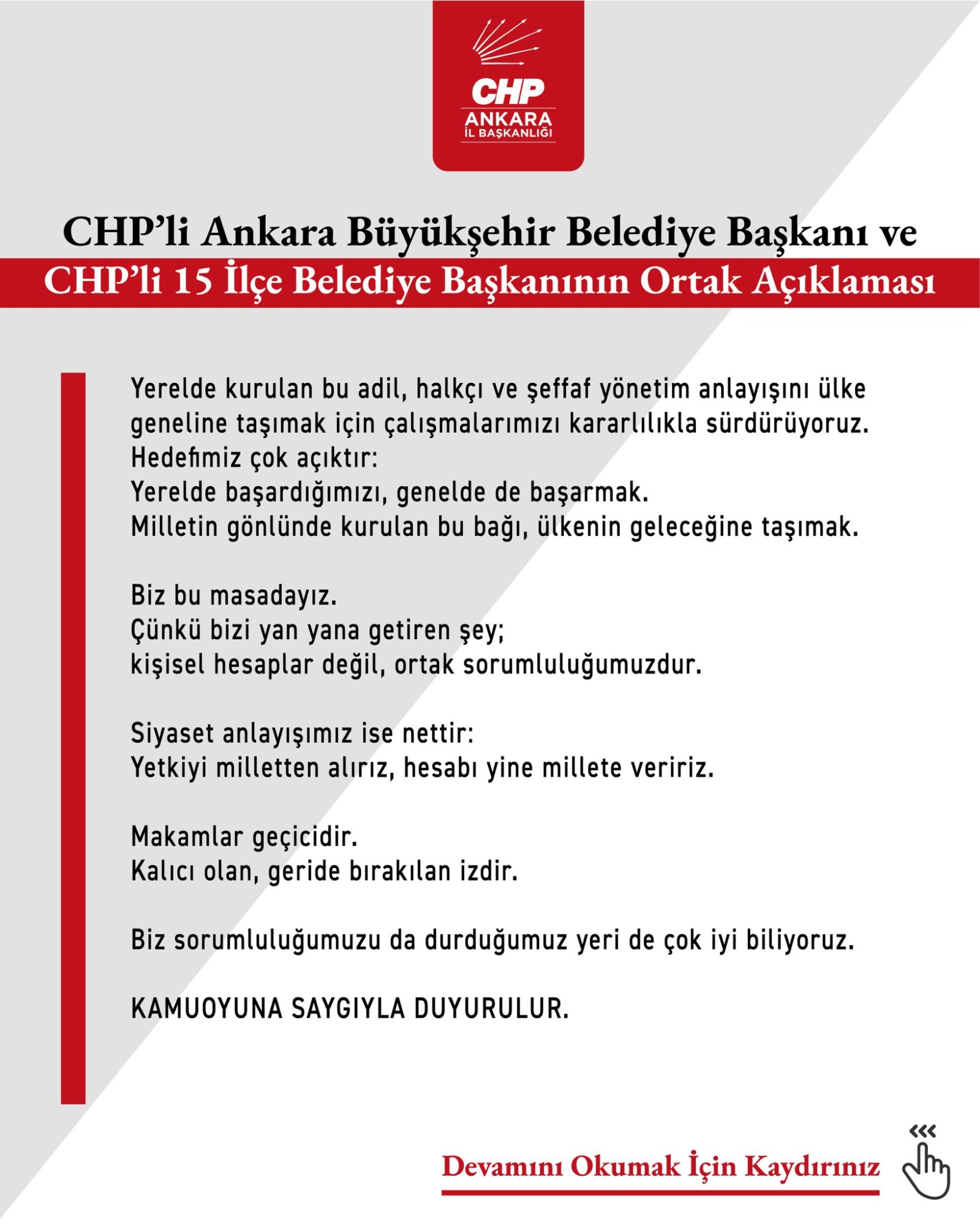 Yerelde kurulan adil, halkçı ve şeffaf yönetim anlayışının ülke geneline taşınması için çalışmaların kararlılıkla sürdürüleceği ifade edildi. "Yetkiyi milletten alırız, hesabı yine millete veririz. Makamlar geçicidir. Kalıcı olan, geride bırakılan izdir" denilen açıklamada, ortak sorumluluğun kişisel hesaplardan daha önemli olduğunun altı çizildi.