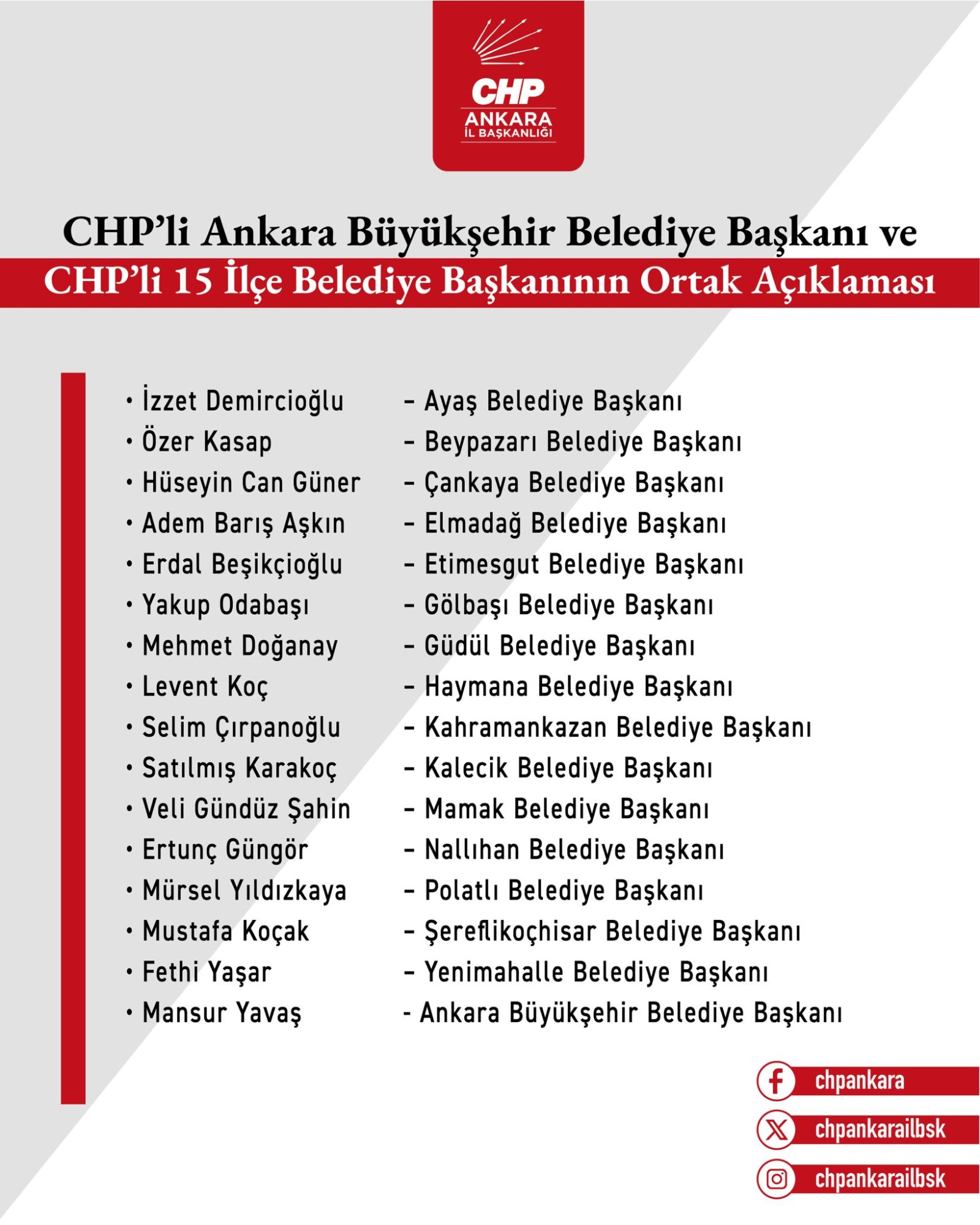 Açıklamaya, Ankara Büyükşehir Belediye Başkanı Mansur Yavaş'ın yanı sıra Ayaş, Beypazarı, Çankaya, Elmadağ, Etimesgut, Gölbaşı, Güdül, Haymana, Kahramankazan, Kalecik, Mamak, Nallıhan, Polatlı, Şereflikoçhisar ve Yenimahalle belediye başkanları imza attı.