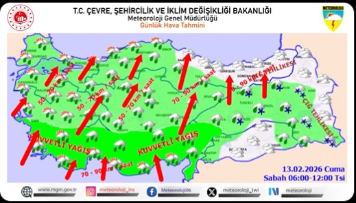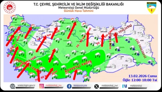 Meteoroloji Genel Müdürlüğü, 13 Şubat 2026 Cuma günü için yayımladığı son tahminlerle, yurt genelinde üç farklı ve tehlikeli meteorolojik olaya karşı kırmızı alarm verdi. Mevsim normallerinin üzerinde seyretmesi beklenen hava sıcaklıklarının gölgesinde, şiddetli yağış, kuvvetli rüzgar ve çığ tehlikesi vatandaşlar ile yetkilileri tedbir almaya çağırıyor.
